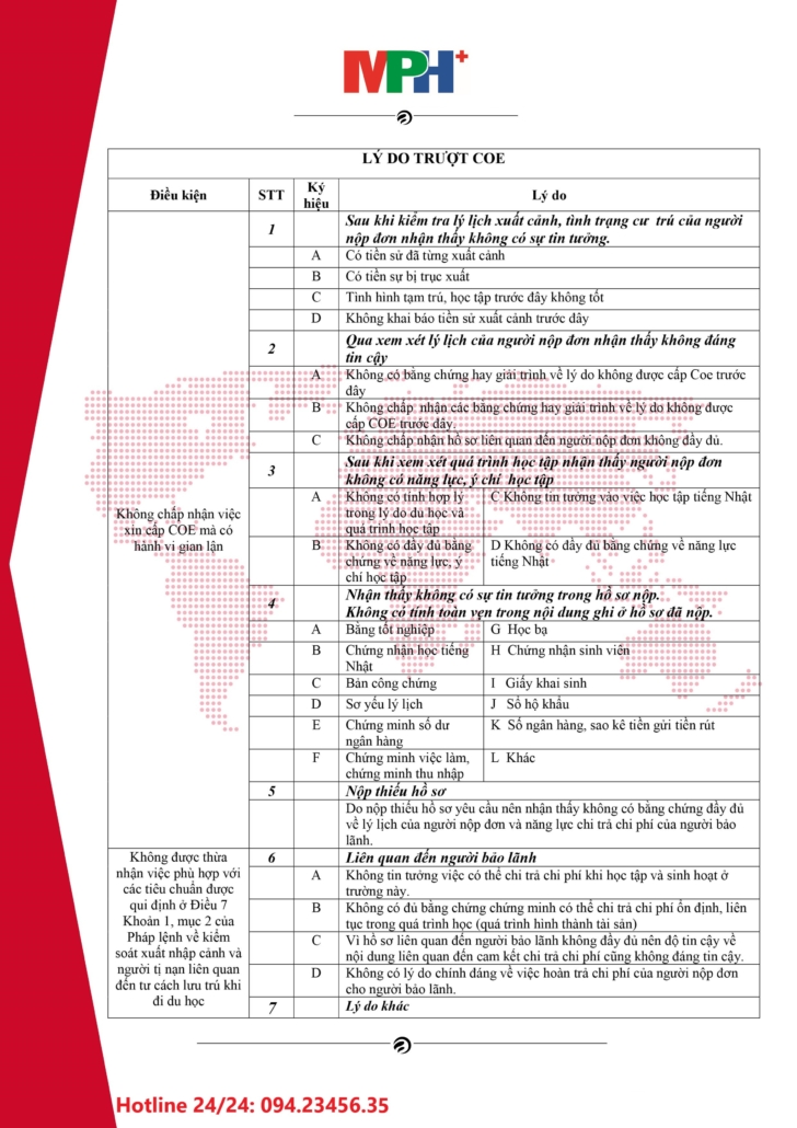 Nhiều bạn du học sinh sau khi bị cục xuất nhập cảnh từ chối cấp COE ( Chứng nhận đủ tư cách lưu trú ) thì đều không rõ lý do chính xác mình đã bị trượt COE là gì, khi đến với MPH PLUS thường khá lạ lẫm khi gặp câu hỏi:” Mã lý do trượt là gì?”.
